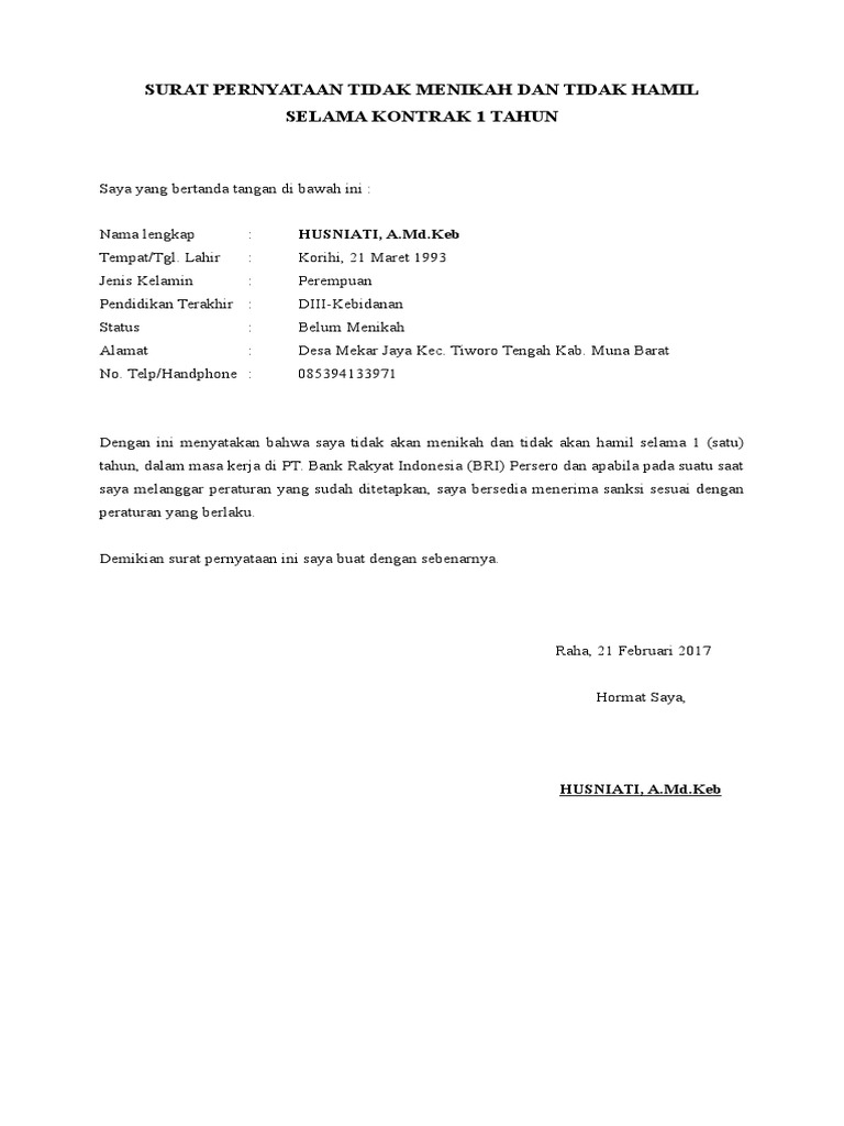 Membawa surat pengantar dari desa / kelurahan. Dokumen ini dapat anda buat sendiri dan bisa dikeluarkan oleh kelurahan di tempat anda tinggal. Selain surat keterangan magang, pihak perusahaan biasanya juga akan memberikan sertifikat magang. Syamsurijal,s.pd menyatakan untuk tidak akan menikah selama satu tahun pertama sejak di terima di (isi sesuai dengan kasdin syamsurijal ,s.pd demikianlah contoh surat pernyataan tidak akan menikah. Yang bertanda tangan di bawah ini :